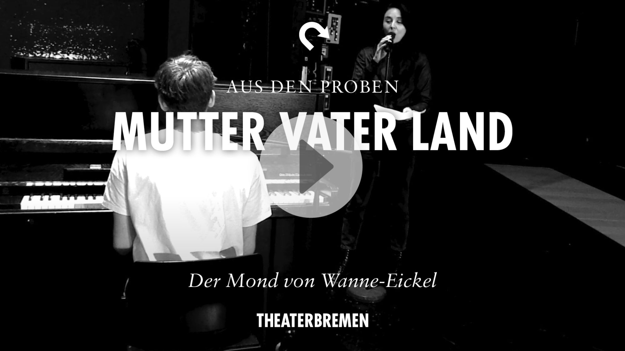 Musikerin Nihan Devecioğlu und Schauspieler Jan Grosfeld geben am Rande der Proben mit dem Duett „Der Mond von Wanne-Eickel“ einen musikalischen Einblick in die Uraufführung von Mutter Vater Land. Die Premiere von Akın Emanuel Şipals neustem Stück wird so schnell wie möglich nachgeholt.