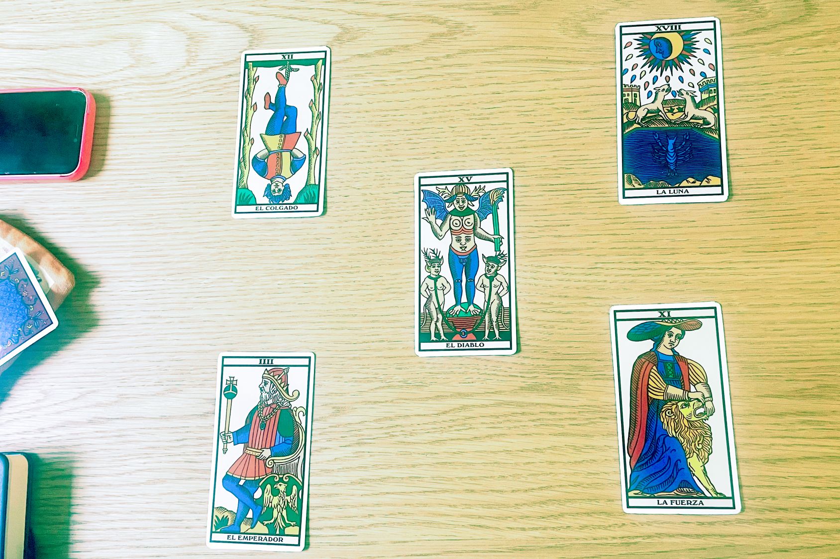 Die letzte Karte, die ich dich schließlich gebeten habe, selbst zu ziehen, liegt in der Mitte. Es ist der Regisseur, der Architekt, der die Eigenschaft hat, ein Beobachter der Dinge zu sein und allen ihre Plätze zuteilt. Die Karte, die du gezogen hast, ist Der Teufel. Auch wenn er unmenschlich aussieht, ist Der Teufel die menschlichste Karte. Sie spricht von Verständnis und Leidenschaft. Einen guten Teufel in dieser Konstellation zu haben, kann ein tiefes Verständnis für die Grenzen und die Wünsche und Sehnsüchte von allem schaffen. Das Verständnis, dass es Schmerz und Verwirrung gibt, dass es Träume und Illusionen gibt, aber dass sie alle Teil dieser Erfahrung des Lebens sind.