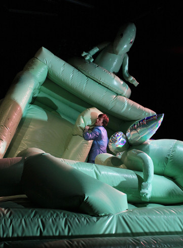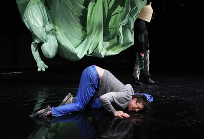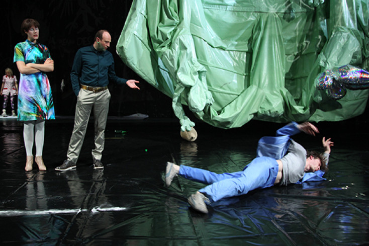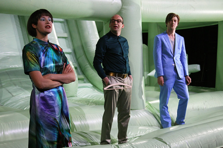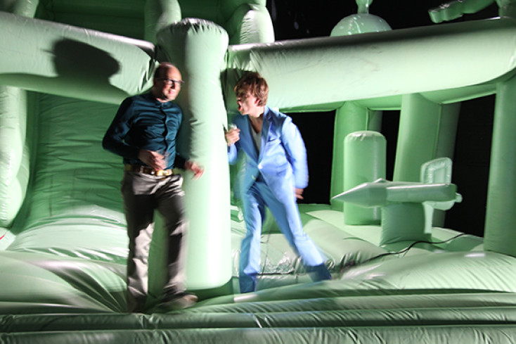 „Auf einer riesigen Hüpfburg (Bühne: Domenz), deren alienartige Gummiwesen allerdings mehr an Geisterbahn denken lassen als an Kindergeburtstag, rennen die Laien-Pornodarstellerin Denise (Nadine Geyersbach) und der gefallene Jurist Anton (Paul Matzke) gegen die so harten wie flexiblen Gummiwände der Gesellschaft an. Es sind die unsichtbaren Grenzen, mit denen sich das Bürgertum gegen die Verlierer zur Wehr setzt.“