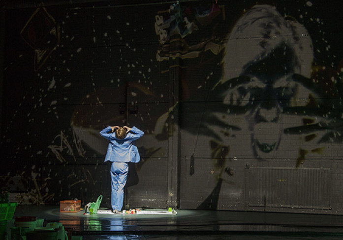 - „Anne Sophie Domenz (Regie und Bühne) entfaltet auch in ihrer zweiten Inszenierung am Kleinen Haus (nach dem Schiller-Trauerspiel „Maria Stuart“ im Juni 2014) eine staunenswerte Suggestivkraft. Nicht nur, aber auch bezüglich der Ausstattung: Eine riesige Hüpfburg in einem besonders scheußlichen Grünton und mit besonders scheußlichen Ungeheuerköpfen setzt sie dem Publikum vor. Im Hintergrund fließt und rinnt und tröpfelt in Gestalt von Videoprojektionen (Jonas Alsleben) Flüssigkeit die Stellwände herab.“