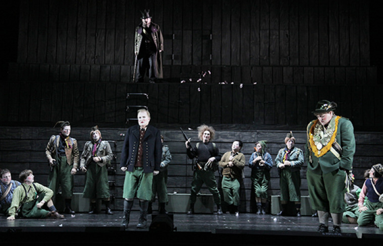 „Mitten hinein ins Volksleben!“ (Caroline v. Weber) – Als ein „Stück deutscher Waldromantik“ rühmte der nationalistische Komponist Hans Pfitzner den „Freischütz“, als „Blumenstrauß zartester und echtester Empfindung“. Deutsch und treu. Auf den ersten Blick scheint die Welt, in der der Jägerbursche Max, um sich Braut und Erbförsterei zu erjagen, Grenzen überschreitet, auch idyllisch schön. Und doch öffnen sich schnell Abgründe hinter dem schönen Schein. Dass sich nach dem Dreißigjährigen Krieg (da spielt die Handlung) und den Befreiungskriegen (da entstand das Stück) einiges im kollektiven Bewusstsein versteckt, sollte nicht verwundern. Mit welchen Gespenstern lässt Max sich ein? Sebastian Baumgarten, einer der gegenwärtig bedeutendsten Musiktheaterregisseure begibt sich auf die Suche nach der deutschen Seele. „Nun, liebe Kinder, gebt fein acht …“