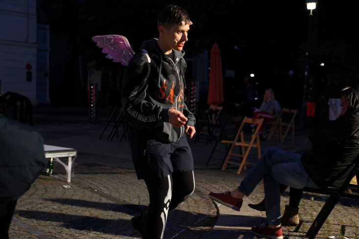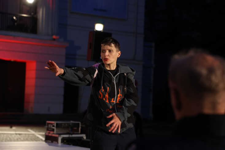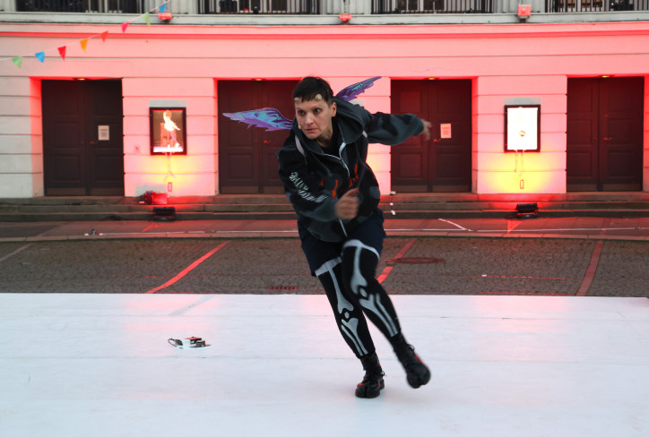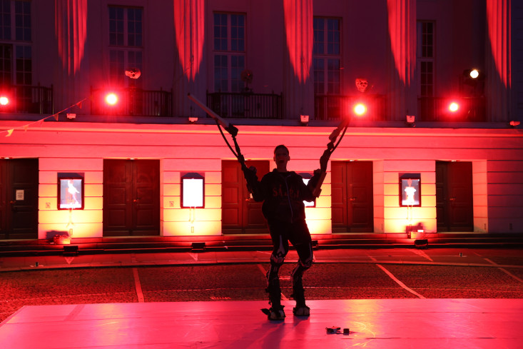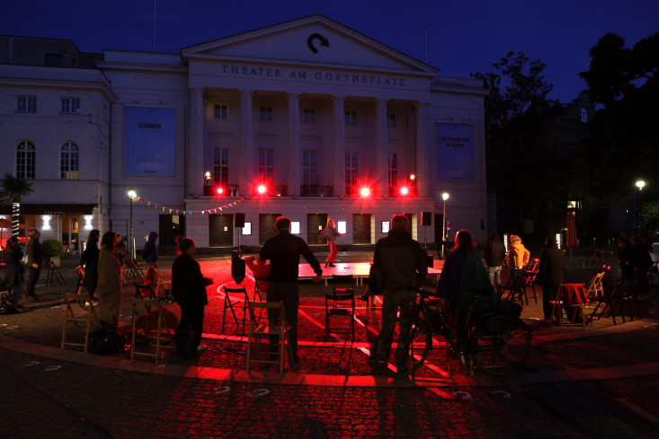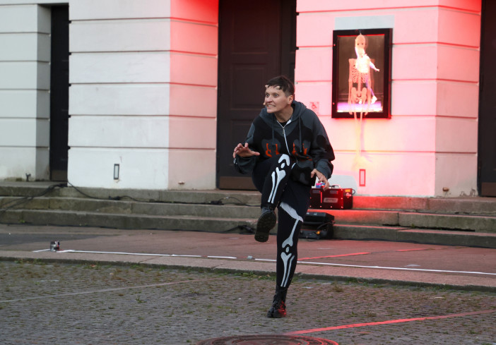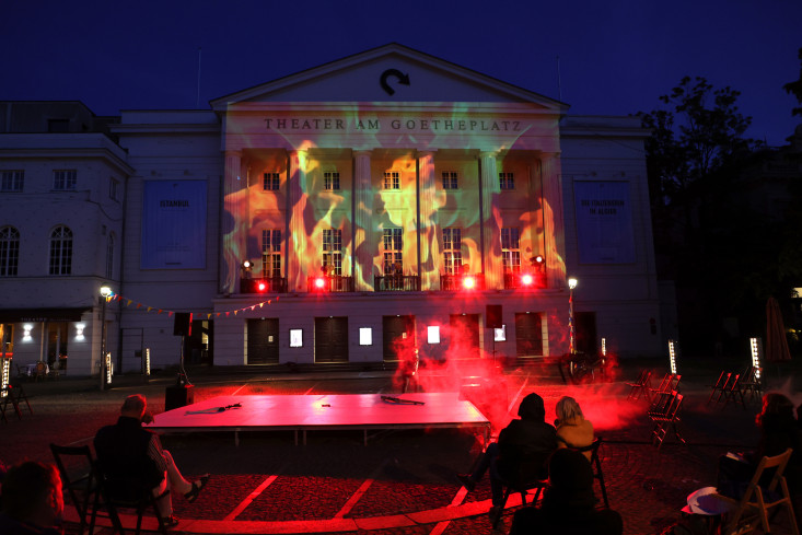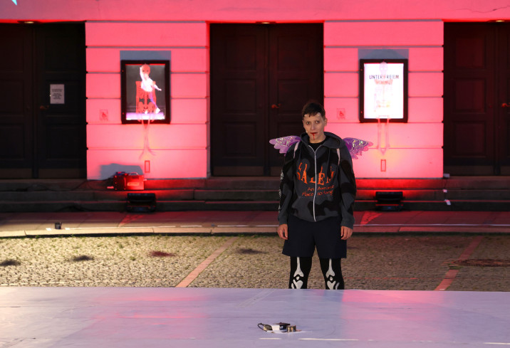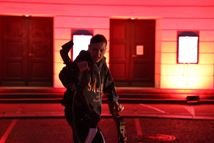 „Die Hölle ist leer, alle Teufel sind hier” (William Shakespeare) – Wie wahr, William, wie wahr! Im Rahmen von „POSSESSED” gehen wir auf die Suche nach den Teufeln im Theater und … in uns selbst! Nadine Geyersbach spricht einen Monolog, wir sind draußen auf dem Goetheplatz und es wird gruselig. Ausgehend von „Rosemary’s Baby” fragen wir, wie das Böse (im Horror und außerhalb) konstruiert, wie situiert und wie personifiziert wird. Geister, Monster, Hexen – welche Bilder schaffen wir, um greifbar zu machen, dass wir von Kräften umgeben sind, die sich unserer Kontrolle entziehen? Im Moment der Aufführung suchen wir gemeinsam nach Formen des Umgangs mit einer zirkulierenden, unsichtbaren Bedrohung. Am Ende werden die guten Theatergeister angerufen. FSK 0.