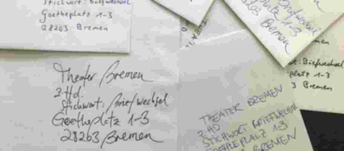 Unter dem Stichwort „Briefwechsel“ schreiben Sie einfach an das Theater Bremen, Goetheplatz 1-3, 28203 Bremen zu Händen der Person, mit der Sie in Kontakt treten möchten. Die Antwort wird Ihnen dann per Post oder Briefbote zugestellt.