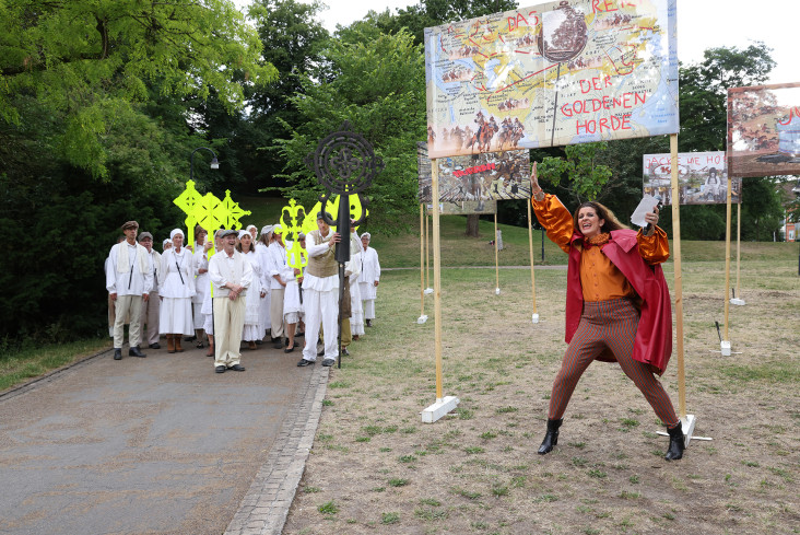 - „Es kann nicht schaden, den Opern-Inhalt zu kennen. Das Geschehen erschließt sich aber auch so, denn die Fassung von ‚Hauen und Stechen‘ (Regie: Franziska Kronforth) ist eine sogenannte Überschreibung – ein radikaler neuer Entwurf, was Inhalt und Musik angeht. Letzterer hat sich der Komponist Alexander Chernyshkow angenommen und viel Volksmusikalisches, eigene zeitgenössische Musik, aber auch elektronische Klänge mit Versatzstücken aus der Oper kombiniert. Das passt gut und macht Lust auf mehr. […] Spätestens jetzt ist es an der Zeit, die flamboyante Ausstattung von Christina Schmitt zu loben, die zwischen Dada und russisch-mongolischen Trachten changiert. Und das extrem spiel- und spaßfreudige Ensemble, die Bremer Philharmoniker, den Chor, den Bürgerchor, die Statisterie, die den Zuschauern freundlich Wege weist. […] Ein mutiger und gelungener Saisonabschluss für das Theater, das sich nun in die Sommerpause verabschiedet.“ (Iris Hetscher, Weser-Kurier, 8. Juli 2022)