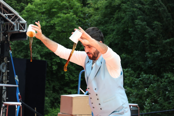Geplant für den vergangenen Silvesterabend – konzipiert, fertig studiert von den Sängerinnen und Sängern, und immer wieder verschoben – hat die „Italienerin“ einen neuen Bestimmungsort gefunden: Algier liegt jetzt in den Wallanlagen, an dem Ort, wo knapp hundert Jahre lang das Bremer Stadttheater stand, bevor es 1944 zerstört wurde. Inzwischen ist der terrassenförmig angelegte Theatergarten ein eingeführter Ort für Open-Air-Projekte und ein optimaler Schauplatz für eine musikalische Komödie, die deutlich aus der Tradition der Commedia dell´arte stammt und mit hinreißend virtuosen Gesangsnummern und dem wohl gelungensten rossinischen Finale punktet: „Cra cra, bum, bum, din, din“ lautet der durchaus dadaistische Librettotext, vertont in eine atemlose Musik, die wie ein überdrehtes Uhrwerk ständig Gefahr läuft, aus dem Takt zu geraten. Die Figuren, deren Probleme, deren Konflikte musikalisch munter abschnurrten wie Rädchen im Getriebe, versinken urplötzlich im Chaos, verlieren den Kopf, den Verstand. Man ist konsterniert, man ist total verwirrt, was Isabella, die Italienerin, schon kurz nach ihrer Ankunft angerichtet hat. Status, Hierarchie, Geschlechterhoheit, Herkunft, alles steht in Frage, alle geltenden Werte sind auf den Kopf gestellt.