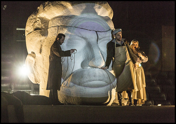 „Der Tod ist die Lösung aller Probleme: Kein Mensch – kein Problem.“ (Stalin) — Ausgehend von Archivmaterial und historischen Quellen untersucht „Kein Mensch“ das Verhältnis von Ideologie und Kunst zwischen zeitgenössischer Oper und Installation. 1949 gewann der Bildhauer Otakar Švec gegen seinen Willen den Wettbewerb zur Anfertigung des Stalin-Denkmals auf dem Prager Letná Plateau. Ihr Bau dauerte sechs Jahre. In der Zwischenzeit starb Stalin, die Ehefrau von Švec beging Selbstmord und auch der Bildhauer nahm sich kurz vor der Enthüllung des Denkmals 1955 das Leben. Sein Name wurde nicht erwähnt. Einige Jahre später wurde die Statue als Reaktion auf den politischen Wandel in der Sowjetunion und die Kritik des Personenkults im Rahmen einer geheimen Sprengung zerstört.